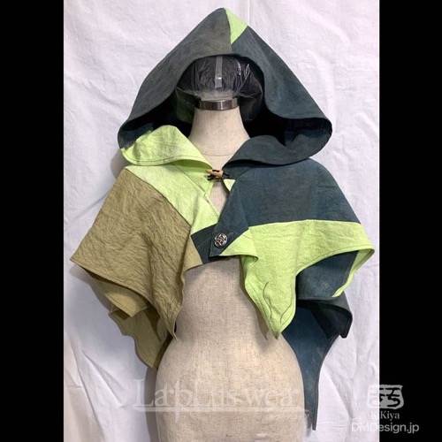 通常販売のフードより背中側が長くケープ(マント)のような雰囲気もありつつ全体として森の中に紛れる落ち着いたアースカラーをベースに、明るいグリーンで木漏れ日を受けるイメージで全体的に重くなりすぎない雰囲気を感じていただけたらと思います。また、目立たない縫い込みで自然を表す模様を仕込んでいます