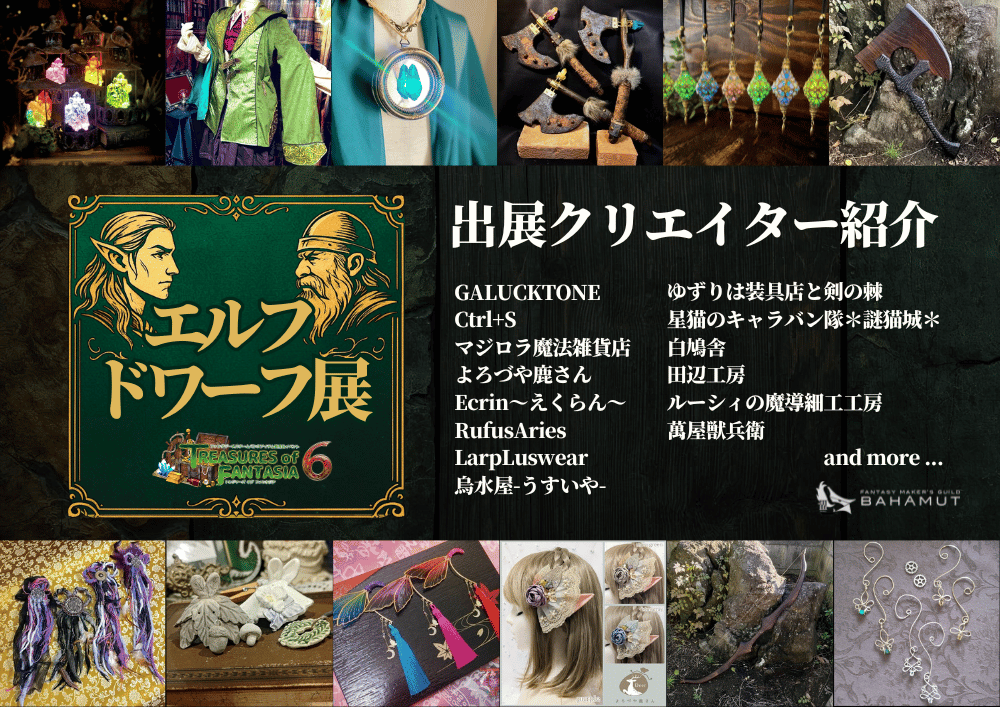 ファンタジーでおなじみの「エルフ」と「ドワーフ」をテーマにした作品を、公式販売所にて特別販売いたします。当日はエルフとドワーフの衣装をまとったキャストがロールプレイを交えながらアイテムをご案内します。