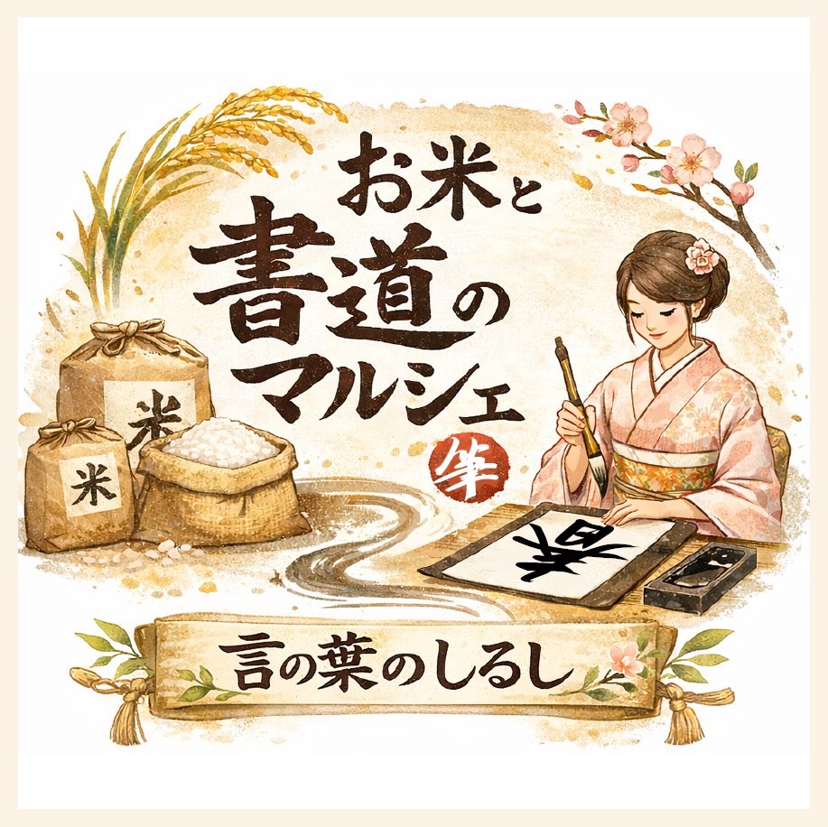 着物姿で来場者の想いを伺い、色紙類や米袋に毛筆で文字をしたためて提供します。希望者は書の体験を行い、自身で書いた文字を色紙類や米袋に仕上げることもできます。