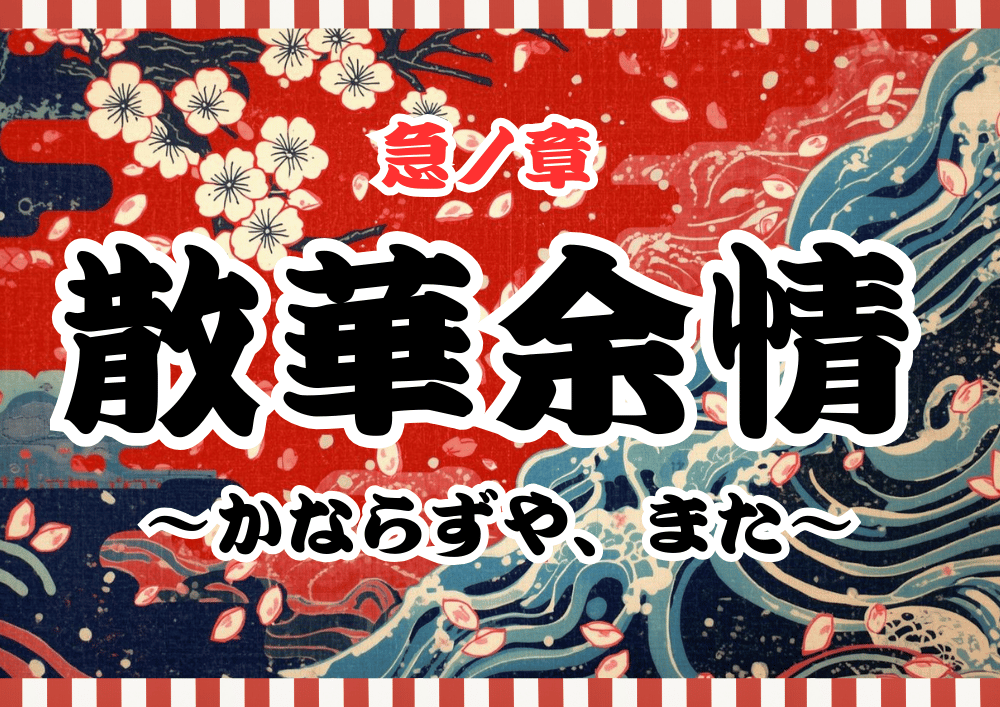 宵山の結びとして、桜の下にて祝宴の支度が整えられる。人々は杯を手に、春の宵の桜を見上げる。その賑わいの中、藤山次郎太と水楢しのの間にもまた、その縁はいっそう深まってゆく。