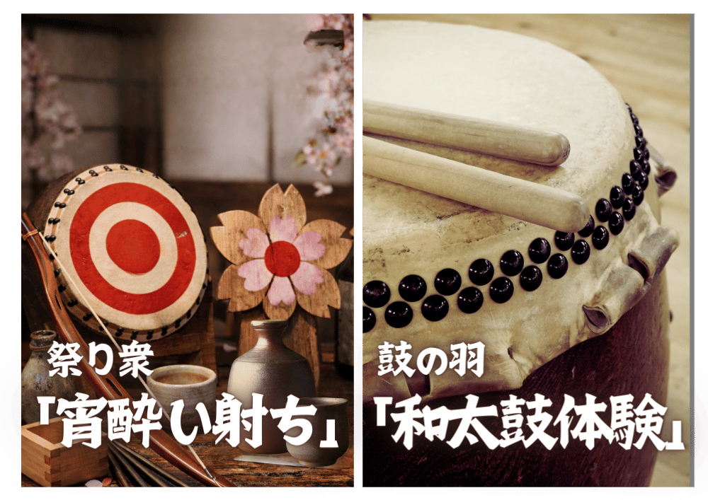 忍びの手裏剣さばきや刀の扱いを学び、さらに祭り太鼓衆による太鼓打ちの手ほどきも受けられる、体をもって楽しむ修練の場。心と技を磨きながら、祭りの熱気を存分に味わっていただけます。