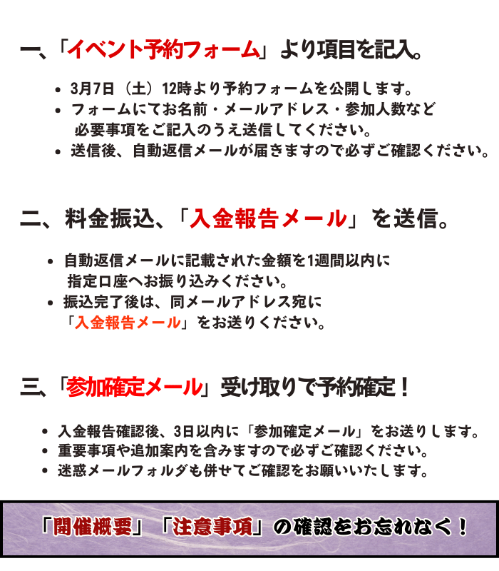 三月七日(土)より、イベント予約の受付を開始いたします。 本ページでは、ご予約方法および追加オプションの詳細についてご案内いたします。