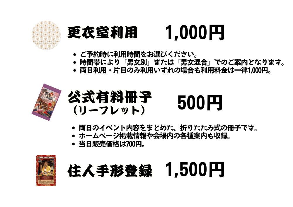 イベント参加料とは別に、各種追加オプションをご用意しております。事前予約時のみ購入できるコンテンツ割引チケット、予約者限定でご利用いただける更衣室、公式グッズのご案内などがございます。