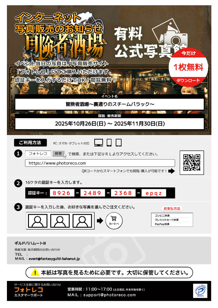 10月18日&19日に開催した冒険者酒場~裏通りのスチームバラック~にて撮影した公式カメラマンによる写真を写真販売サービス「フォトレコ」内にて公開中です。