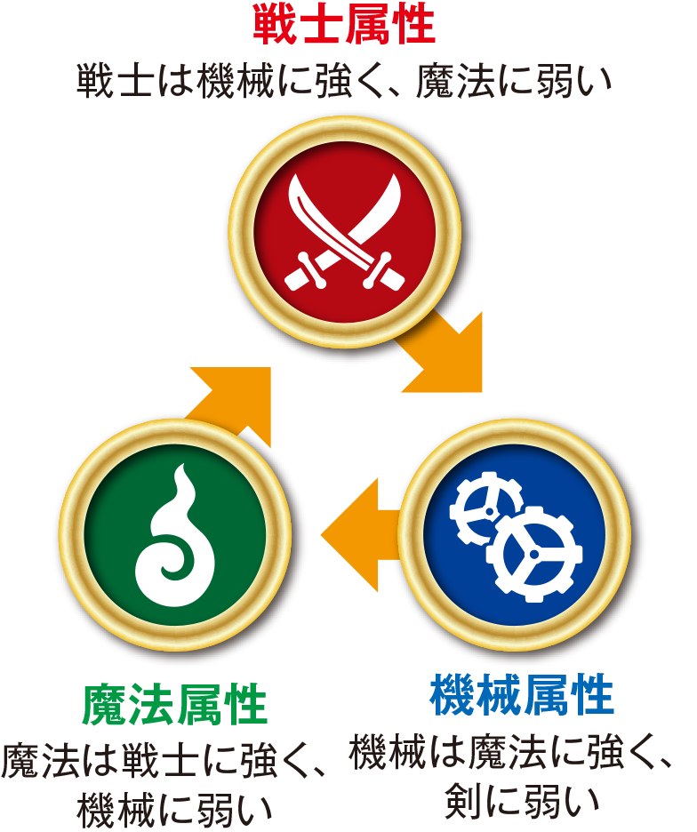 ①属性マークの力関係で勝敗が決まる。
